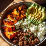 - Assemble Bowls: In each serving bowl, layer the roasted sweet potatoes, cooked ground beef, sliced avocado, and a dollop of cottage cheese.
