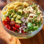 A vibrant and nutritious chicken pasta salad packed with protein, healthy fats, and delicious vegetables, perfect for a light lunch or quick dinner.