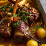 Serve the Lamb Shanks Massaman Curry hot over a bed of fluffy steamed jasmine rice. The rich sauce pairs perfectly with the rice, soaking in the flavors. For added color and heat, garnish the dish with slices of red chili and fresh cilantro. This dish makes a stunning centerpiece for any dinner table.