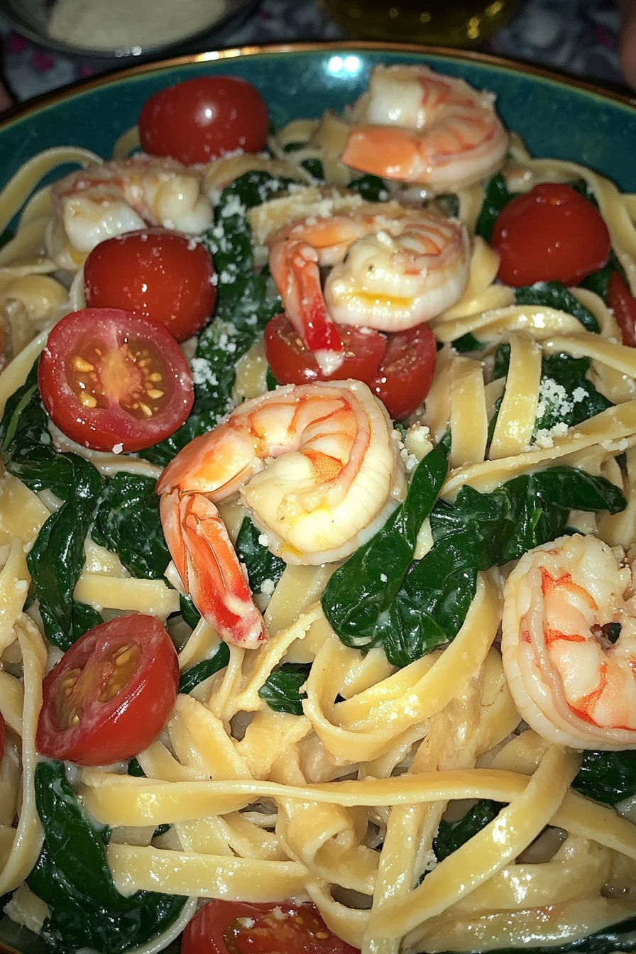 SHRIMP TOMATO SPINACH PASTA IN GARLIC BUTTER SAUCE