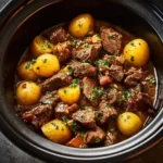 A comforting slow-cooked dish featuring tender beef bites and buttery baby potatoes, perfect for family dinners or cozy gatherings.